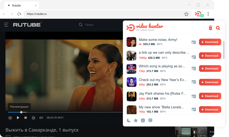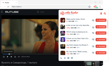 Вы можете легко скачать видео с Rutube онлайн, используя Rutube Video Downloader. Это бесплатное расширение для загрузки и сохранения видео в форматах 4K, 2K, Full HD и HD с Рутуб. Video Hunter обеспечивает простой способ скачивания видео с Rutube.